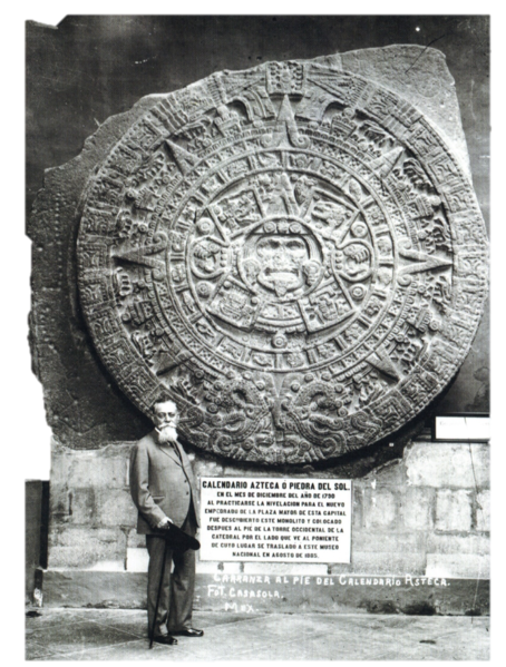 The Aztec sun stone held at the National Anthropology Museum in Mexico City carved between 1502 and 1521. Whilst not a functioning calendar, it uses the calendrical glyphs. Right, a picture of the stone from 1917 showing its scale.
