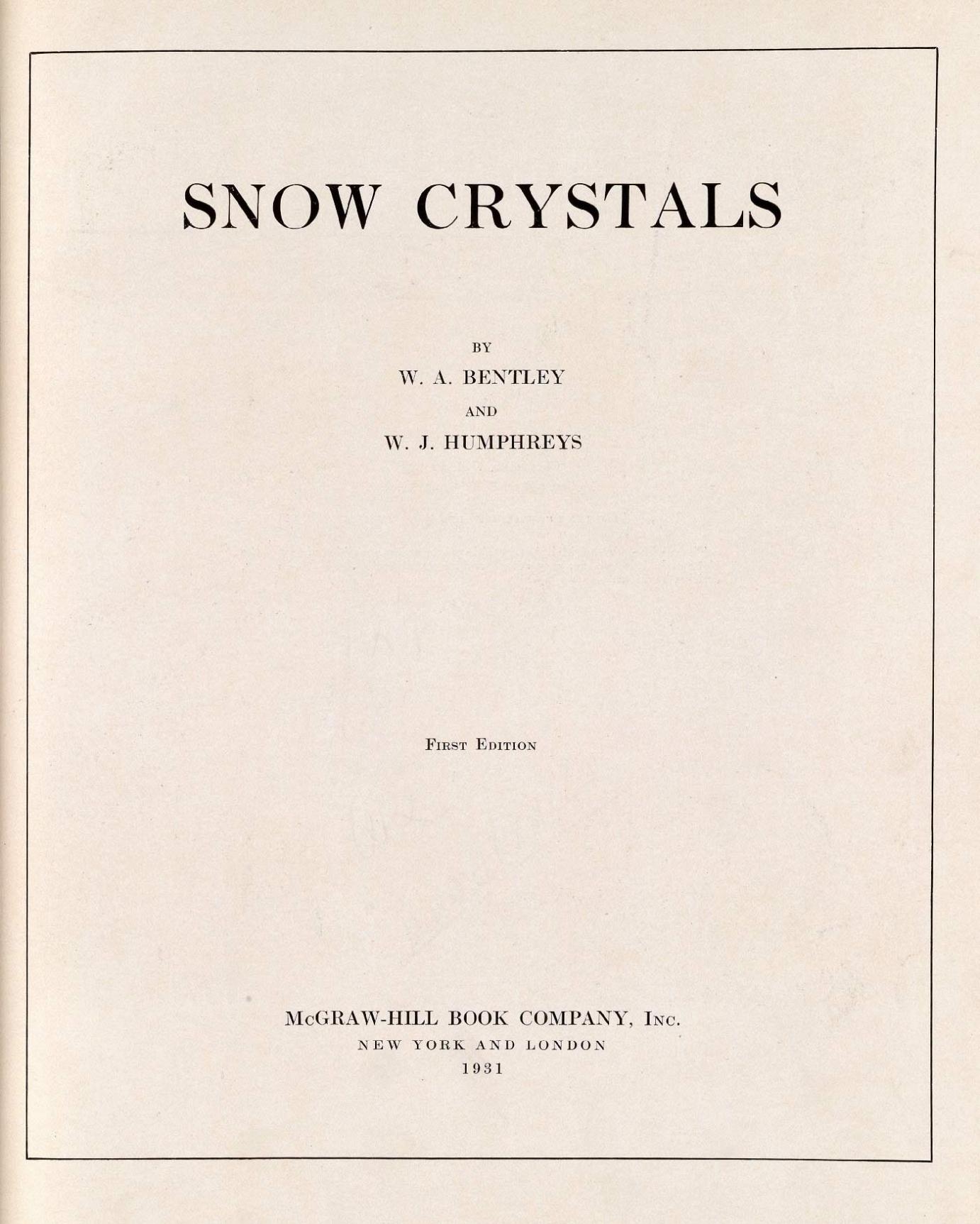 The title page and one of the printed photograph pages from Bentley’s 1931 book, Snow Crystals.