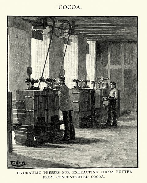 Chocolate continued to be drunk largely by the elite up until the early 1800s. Then, in 1828, a Dutch chemist called Coenraad Johannes van Houten (or possibly his father) changed the world of chocolate making forever. In this year, Houten found a way to treat cacao beans with alkaline salts so that it turned into powdered chocolate which was far easier to mix with water than the process up to that point. It was relatively easy to do, and this discovery came at a similar time to a second invention of his: the cocoa press. Houten created this machine which was able to cheaply separate cocoa butter from roasted cocoa beans and thus make cocoa powder which could be used in a variety of chocolate products. Through these two processes, Houten had found a way to mass produce cheaper chocolate powder and thus made chocolate available to a much wider audience than before.
