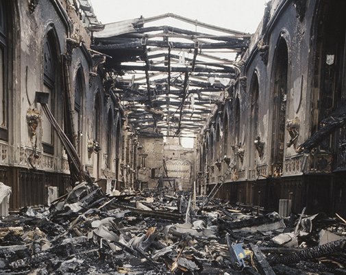 The fire seen blazing in the Upper Ward, and St George’s Hall immediately after the fire.