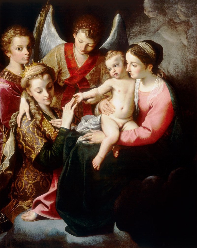 Veronese’s Mystic Marriage of St. Catherine (1565-70) depicts the dream Saint Catherine of Alexandria had after her baptism, where the infant Christ took her as his celestial spouse; she awoke to find a ring on her finger and kept it on for the rest of her life as an emblem of her faithfulness and fidelity to Christ. The Matrimonio mystico is an ultimate display and declaration of spiritual connection to Christ, basically stating someone is ‘married to their faith’. The majesty of this painting shows the profound importance of this declaration. Catherine, adorned in finest regalia and crown to signify her royal blood, presents her hand to the infant Christ, who rests in the Virgin Mary’s arms, surrounded by innumerable angels. In Carracci’s Mystic Marriage of St. Catherine (circa 1585), he seems to swap majesty for intimacy and realism. In his scene, the Virgin Mary and infant Christ are depicted as relatively mundane figures with nothing separating them from the earthly realm. Their expressions are soft, and the use of light and dark is gentle, depicting this intimate holy moment opposed to the triumphant, populated painting by Veronese.