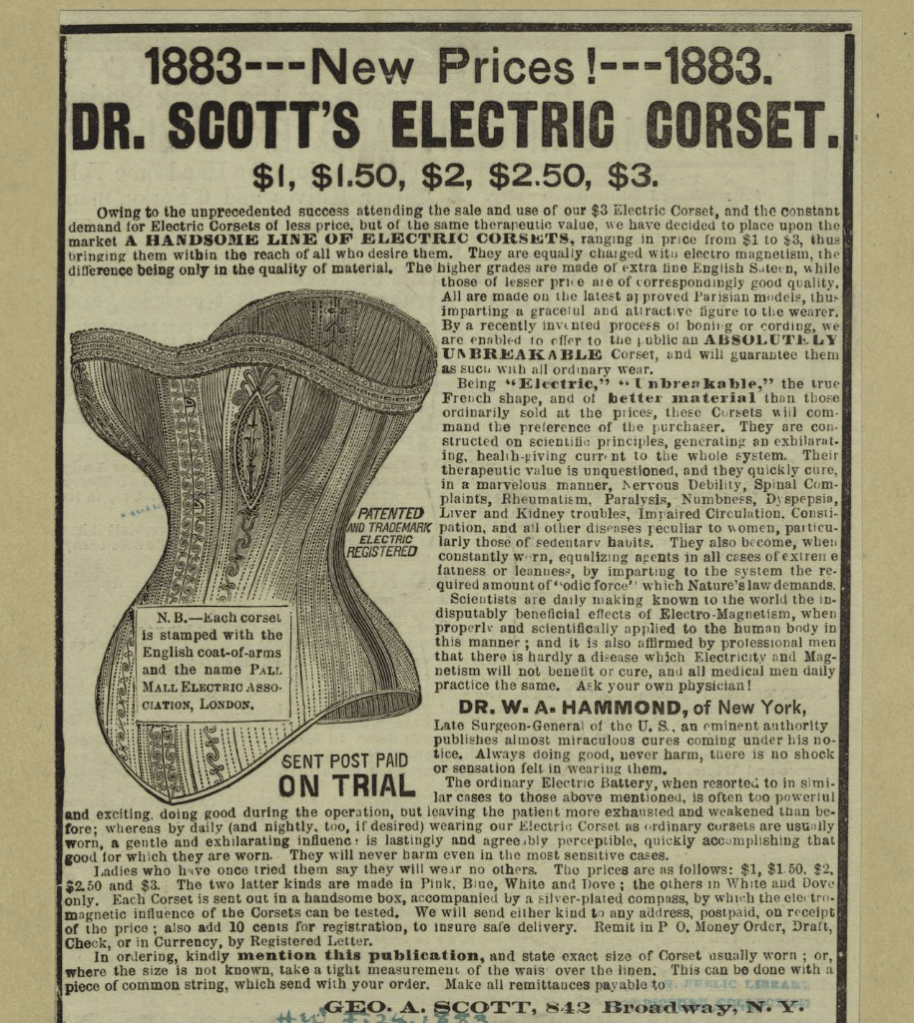 Understandably, these items became very popular, and numerous companies tried to take advantage of the sales boom. An 1883 advert by “Dr Scott” extolled the “unprecedented success” of its $3 electric corset, and explained it was now making more budget-friendly options from $1 and above to bring them “within the reach of all who desire them”. The advert uses emotive language to convince the wearer of its medical backing, saying their “therapeutic value is unquestioned”, that they “are constructed on scientific principles”, citing “scientists”, “medical men” and even name-checking Dr W A Hammond of New York, late Surgeon-General of the US. It is easy to see why people were influenced in the face of such medical claims, just as people have been swayed in the decades since by many other products claiming to be cure-alls.