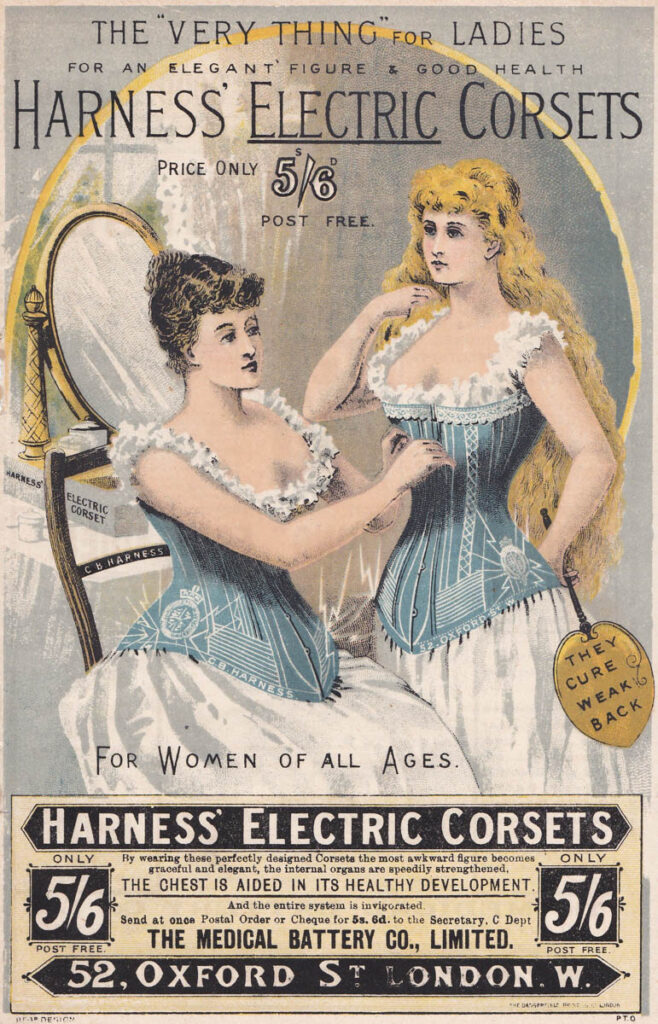 Corsets were still highly fashionable in western society as a way to shape a woman’s figure to a pleasing aesthetic based on curves and tiny waists. But now, with the help of electricity, feminine health issues could be simultaneously tackled. Alongside looking good, women could now feel good too. Corsets were lined with metals like copper and zinc, or used magnets, to try and generate low-level electric currents to convince wearers of their restorative powers. When used by women, these corsets claimed to help with menstrual cramps, weak backs, chest health, spinal complaints, paralysis, liver and kidney troubles, and a whole other host of ailments.