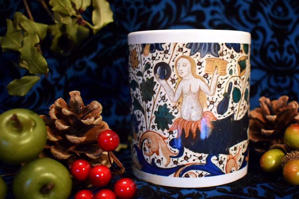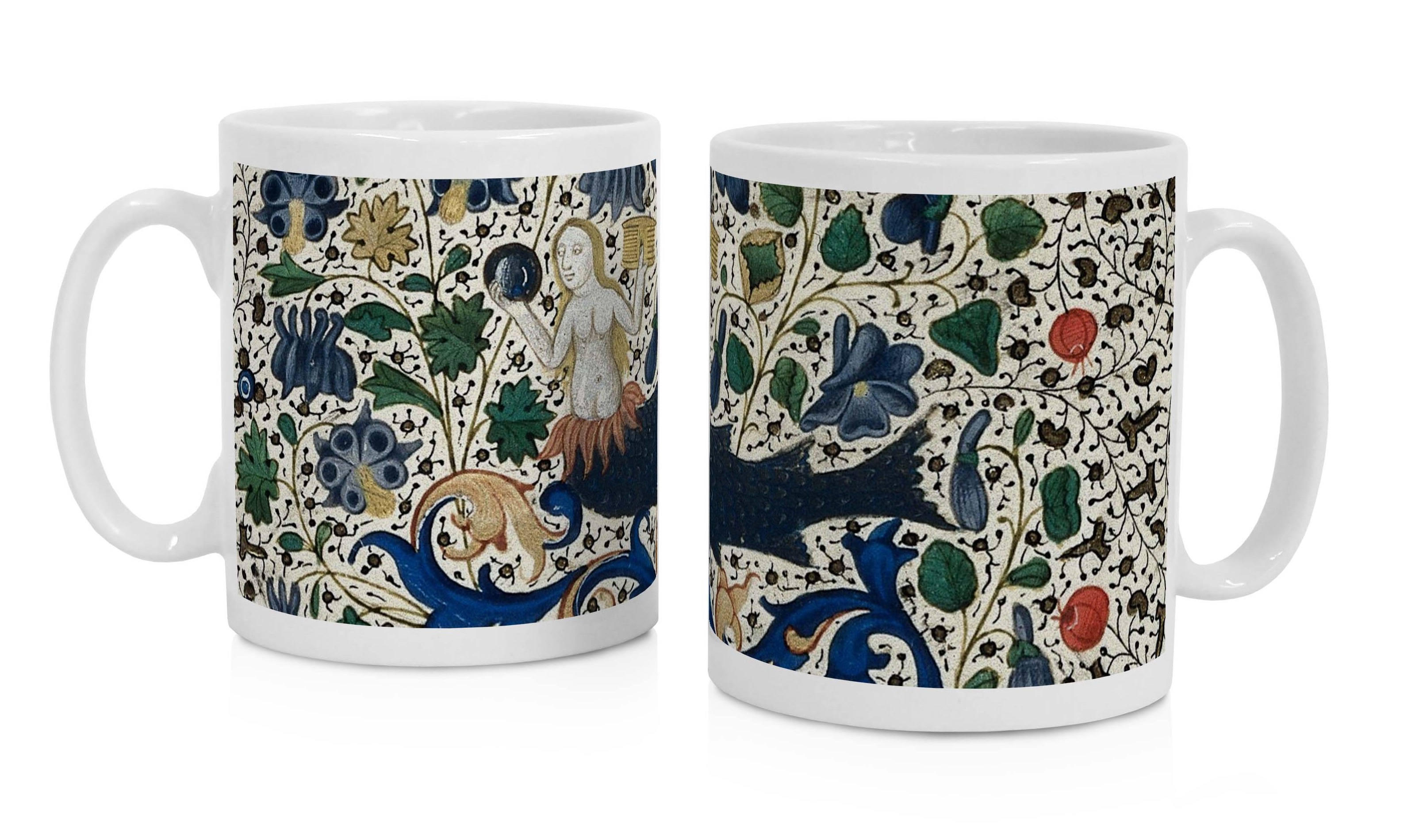 Detail of a miniature of a mermaid with a mirror and comb, c.1460-1487, from British Library Harley 4372  f. 79v. A mug with a mermaid holding a mirror and comb from a fifteenth-century manuscript. Postage included, UK only.