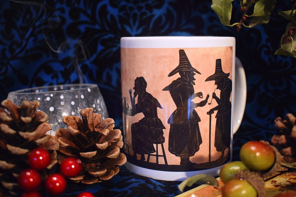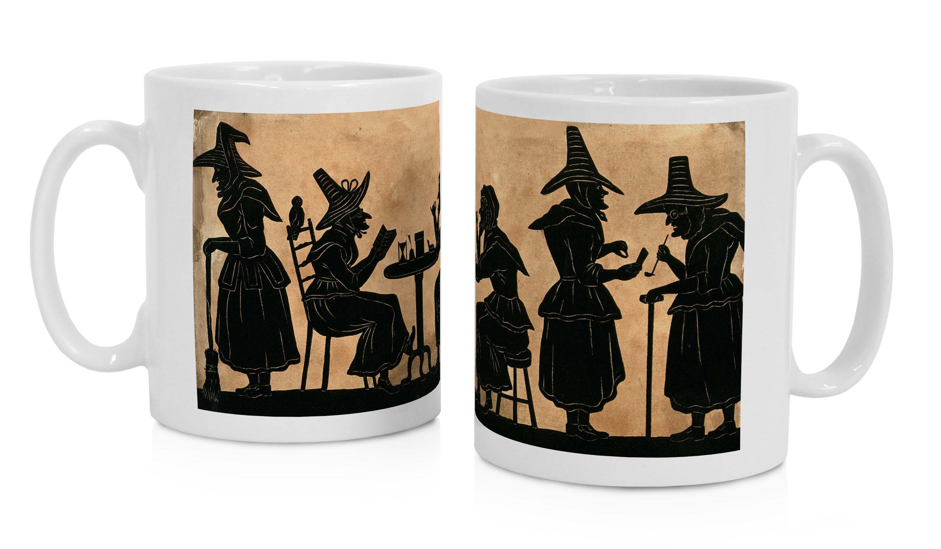 Witches: five silhouetted figures. Aquatint, 1815, from the Wellcome Collection. A mug with a group of witches from a nineteenth-century aquatint. Postage included, UK only.
