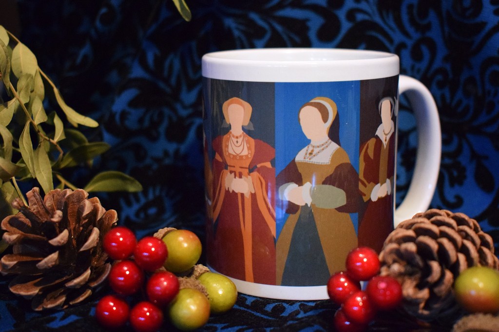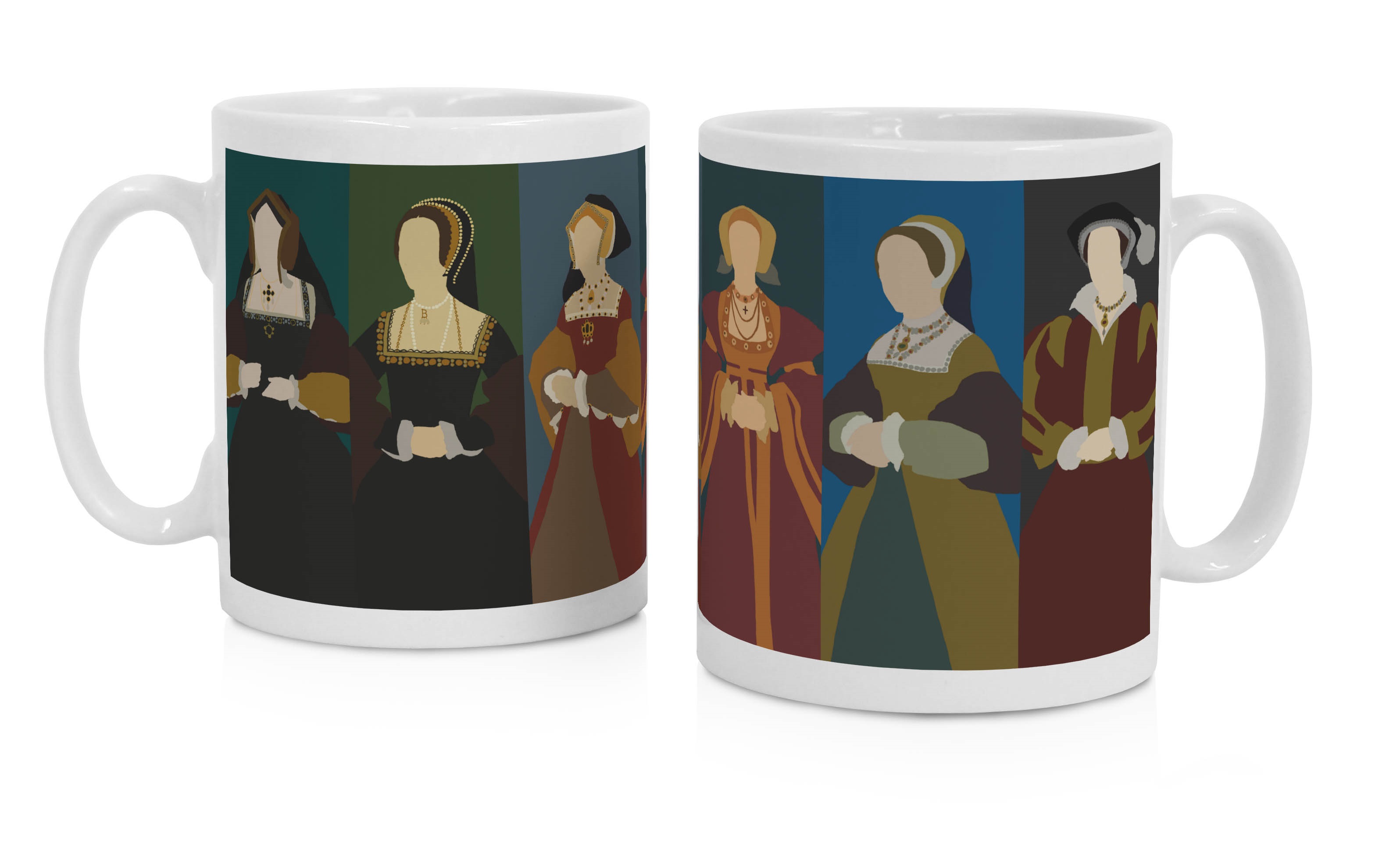 A mug with my own versions of portraits of the six wives of Henry VIII: Catherine of Aragon, Anne Boleyn, Jane Seymour, Anne of Cleves, Catherine Howard and Catherine Parr. Postage included, UK only.